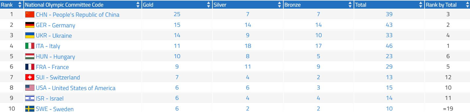 Тепер у скарбничці нашої збірної вже 33 медалі (14 золотих, 9 срібних, 10 бронзових). Україна продовжує зберігати 3-й рядок медального заліку. Попереду, як і раніше, команди Німеччини та Китаю.