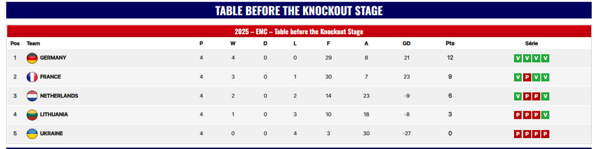 Тріумфатором групового етапу стали німці, які виграли всі 4 гри з різницею голів 29:8. "Бундестім" у півфіналі зіграє проти Литви. Французи, посівши друге місце, за путівку в фінал зійдуться з Нідерландами, які є господарями турніру – поєдинки ЧЄ проходять у містечку Будель.