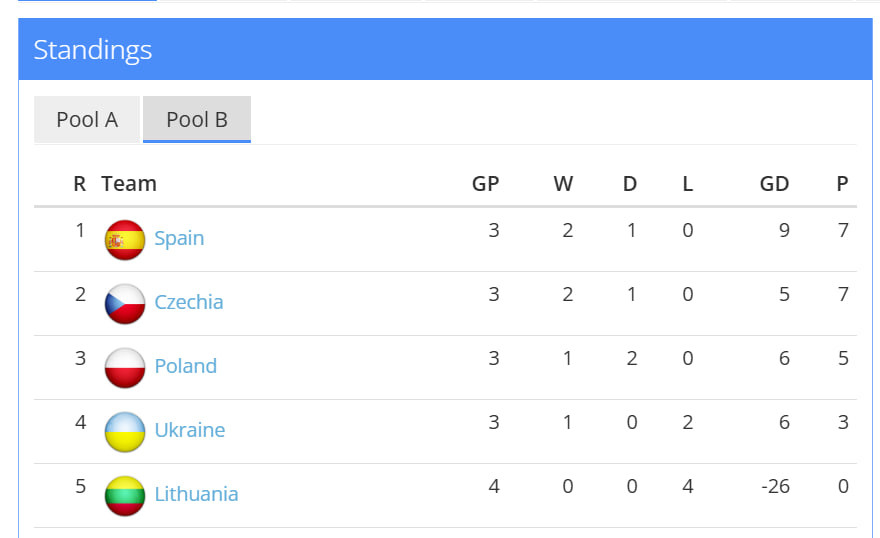 У півфінал виходять перші дві команди. На жаль, збірна України втратила шанси на це. Щоправда, вдалося зберегти місце в еліті, оскільки збірна Литви програла всі чотири зустрічі.