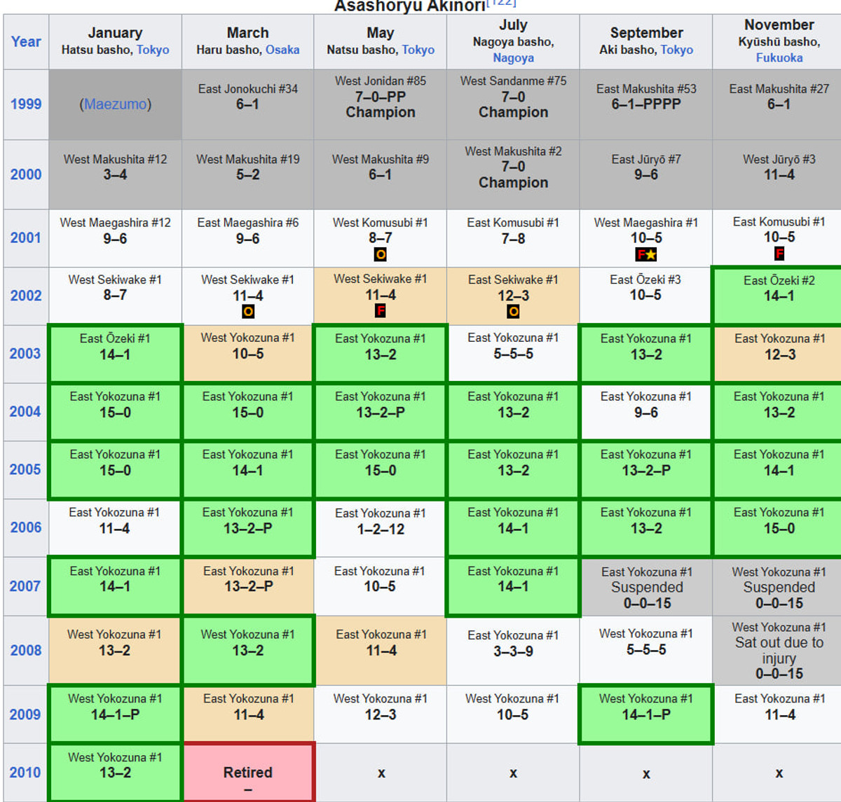 Асашорю демонстрував домінуючі результати. Наприклад, 2005 року він виграв усі шість гранд-турнірів сумо.