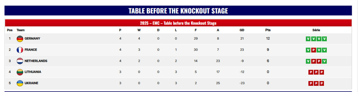 Після третього туру українці ідуть на останній сходинці в турнірній таблиці. 0 очок також має команда Литви. Завтра в матчі з литовцями і визначиться останній учасник півфіналу чемпіонату Європи.