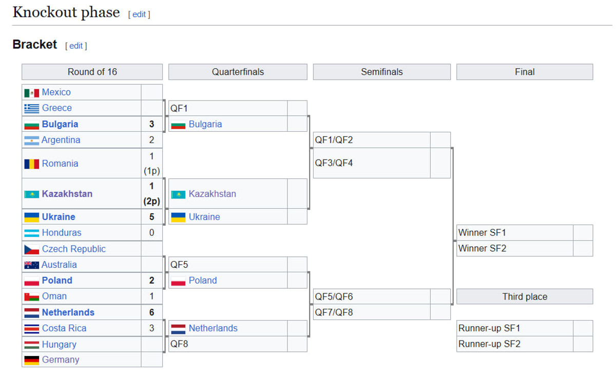 Переможець пари Україна – Казахстан у півфіналі зіграє проти тріумфатора протистояння Болгарія/Мексика – Греція.