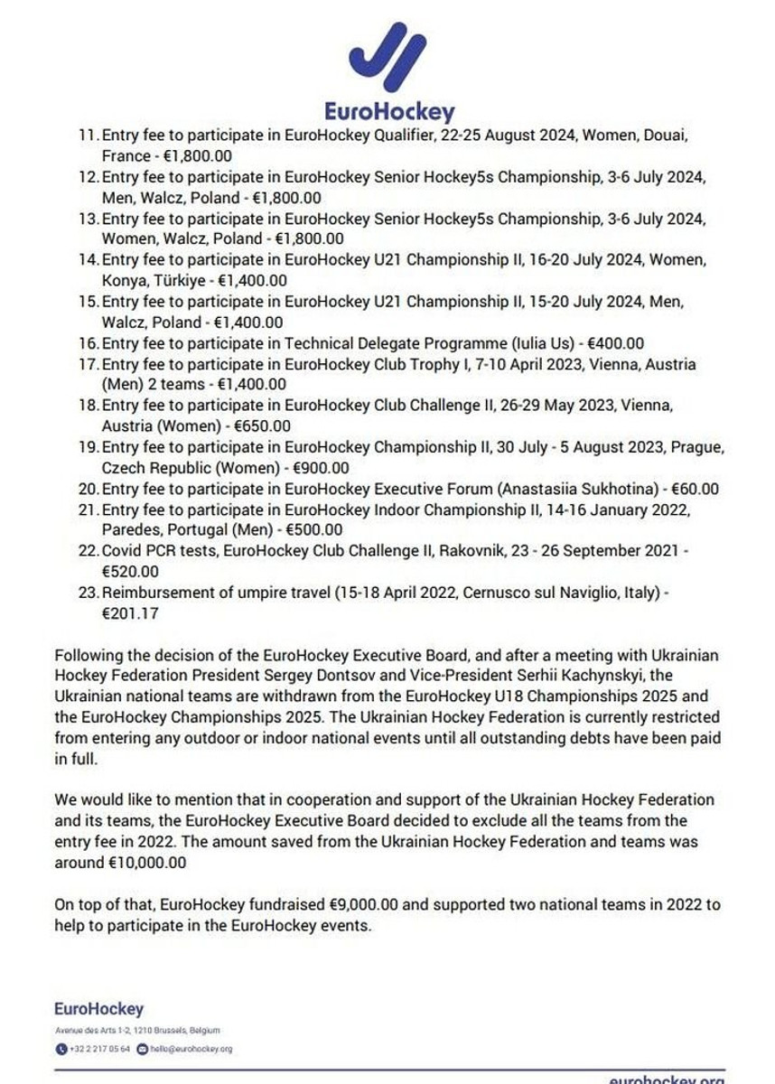 Загальний борг, згідно з листом, який надіслала Європейська федерація з хокею на траві, виник внаслідок 23 пунктів заборгованості української федерації. Основна частина – внески за участі у змаганнях збірними всіх вікових категорій.