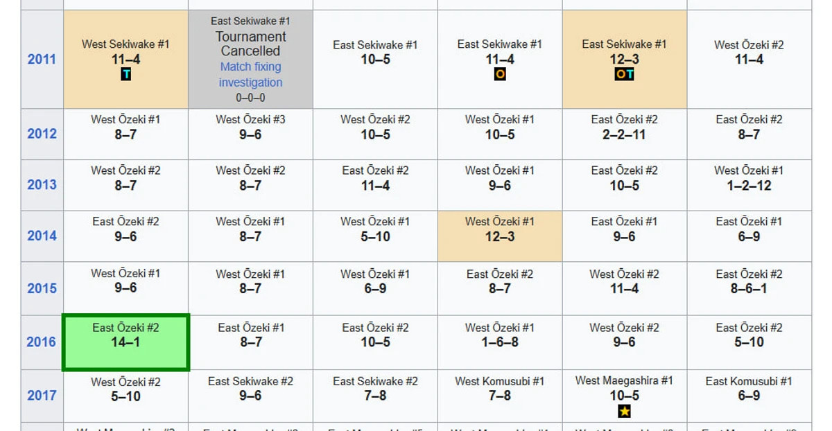 Котошогіку мав статус озекі з грудня 2011 по березнень 2017, але за цей період лише раз здобував юшо (перемогу на турнірі), тому не зумів стати йокозуною.