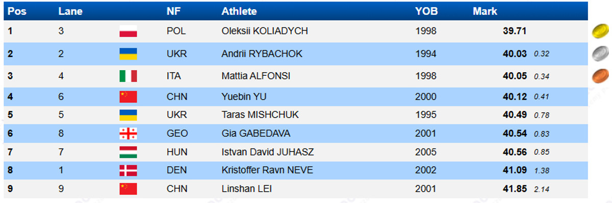 - Олексій Колядич (Польща) – 39,71 секунди;