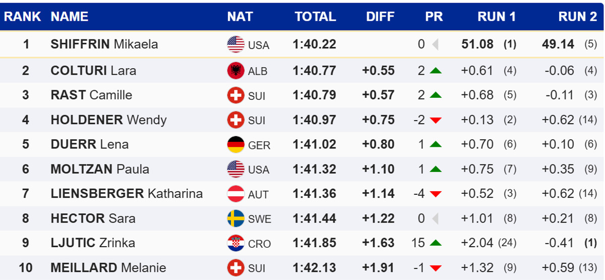 29-річна американка на 0,55 секунди випередила Лару Кольтурі, яка принесла Албанії перший в історії подіум на Кубку світу. Третє місце посіла швейцарка Каміль Раст, для якої це також перше в кар’єрі потрапляння в топ-3.