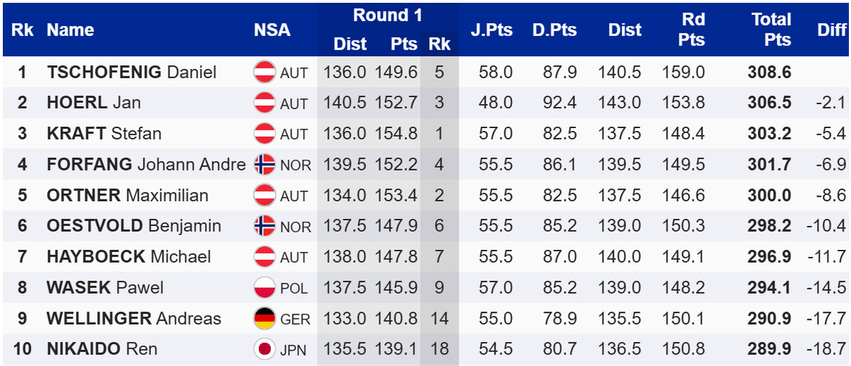 Другим і у загальному заліку, і на етапі став його партнер по команді Ян Хьорль. Топ-3 замкнув ще один австрієць, Штефан Крафт, який втратив лідерство у Турне у своєму заключному стрибку в Бішофсхофені.