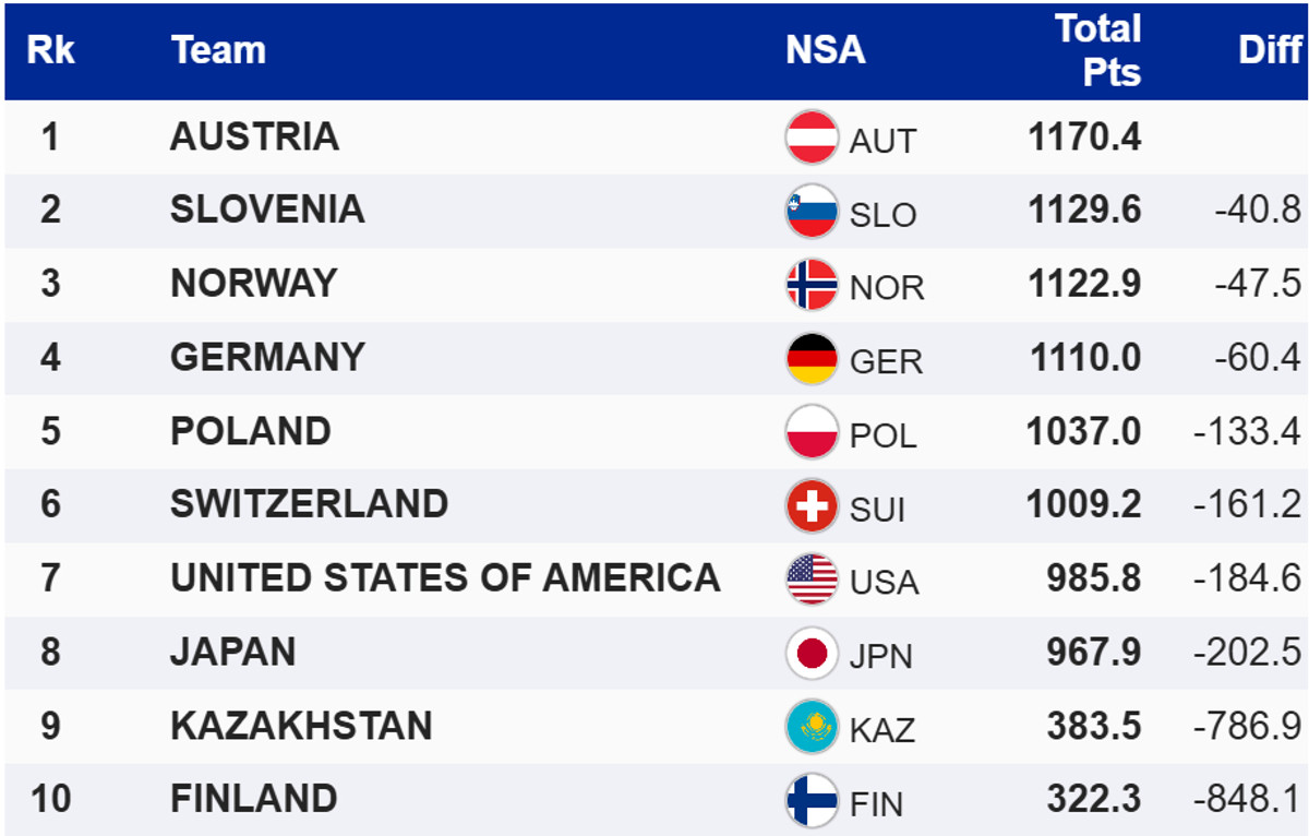 Вони більш ніж на 40 балів випередили словенський квартет Тімі Зайц, Домен Превц, Ловро Кос, Анже Ланішек. Топ-3 замкнула команда Норвегії: Халвор Егнер Гранеруд, Беньямін Остволд, Крістоффер Еріксен Сундал, Йоханн Андре Форфанг. Господарі, збірна Польщі, замкнули в сьогоднішньому турнірі топ-5.