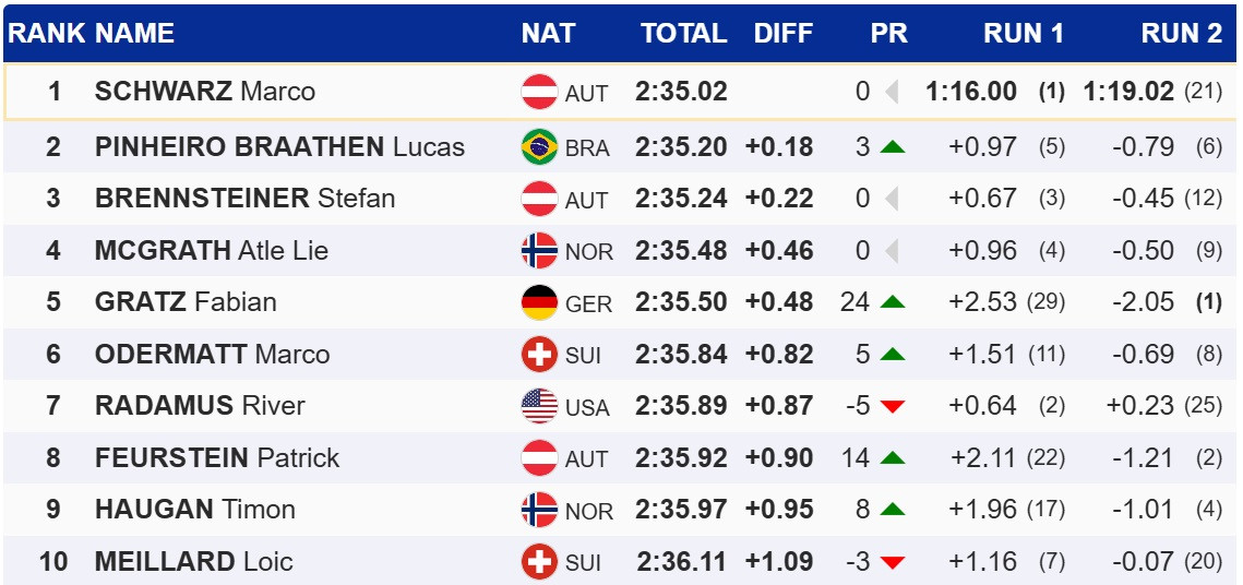 У Альта Бадії Шварц на 0,18 секунди випередив бразильця норвезького походження Лукаса Бротена. Топ-3 замкнув ще один представник Австрії, Штефан Бреннштайнер. Лідер загального заліку Кубку світу, швейцарець Марко Одерматт, лише замкнув топ-6.