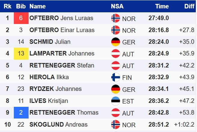 Єнс на 27,8 секунди випередив свого старшого брата Айнара Луроса Офтебро, який фінішував другим. У суботньому старті він посів третє місце. Топ-3 в Гундерсені замкнув господар змагань, німець Юліан Шмід, який у фінішному спринті випередив лідера загального заліку Кубку світу, австрійця Йоханнеса Лампартера.
