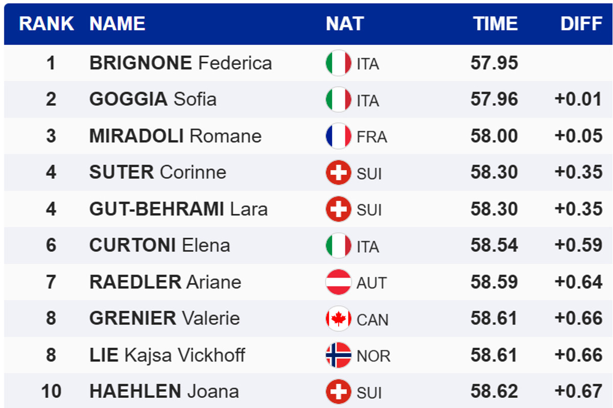 Швейцарка Лара Гут-Бехрамі розділила четверте місце з партнеркою по команді Корінн Сутер. Це дозволило Бріньоне перехопити червоний біб лідера заліку Кубку світу в супергіганті.
