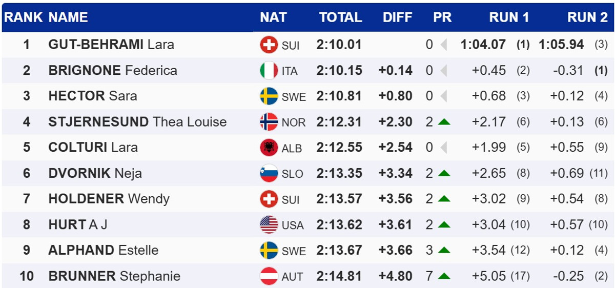 Вона на 0,14 секунди випередила Федеріку Бріньоне, яка завоювала Малий кришталевий глобус у гіганті. Її головна суперниця, новозеландка Елін Робінсон, лідирувала перед стартом з перевагою в 5 балів, проте зійшла з дистанції на першій спробі.