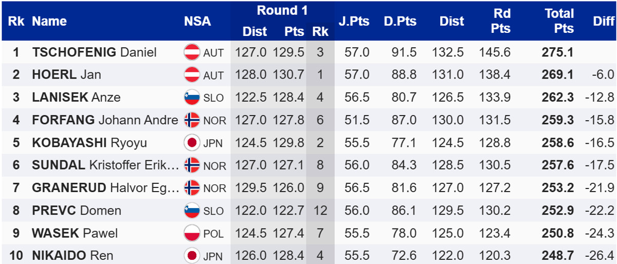 Другим із відставанням у 6 балів фінішував партнер Чофеніга по збірній Австрії та найближчий переслідувач у генеральній класифікації, Ян Хьорль. Топ-3 замкнув словенець Анже Ланішек. Переможець вчорашнього особистого турніру, норвежець Йоханн Андре Форфанг, фінішував четвертим.