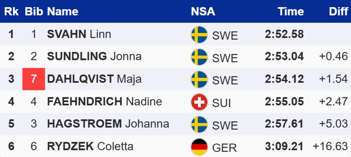 У жінок другу поспіль перемогу здобула Лінн Сван, яка напередодні виграла і розділку. В фіналі спринта вона випередила двох партнерок по команді – Йонну Сундлінг і Майю Дальквіст. Останній це третє місце дозволило завоювати Малий кришталевий глобус у спринті.
