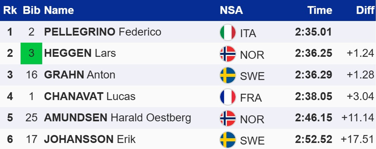 У фіналі Пеллегріно випередив норвежця Ларса Хеггена та шведа Антона Грана. Йоханнес Клебо, який напередодні виграв розділку класикою, спринт пропускав через наслідки струсу мозку минулого тижня у Драммені.