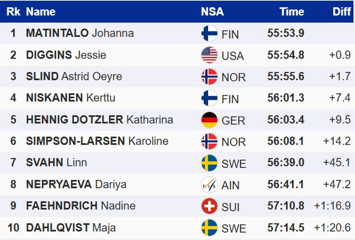В фінішному спринті Матінтало випередила лідерку загального заліку Кубку світу, зіркову американку Джессіку Діггінс. Компанію на подіумі їм склала норвезька лижниця Астрід Слінд, яка атакувала разом із Діггінс на початку гонки. Ця атака була нейтралізована ще до середини гонки.