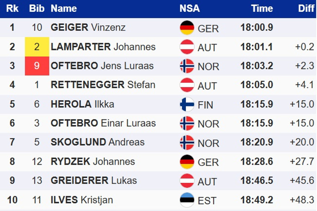 Німецький дворборець Вінценц Гайгер виграв другий етап триденної багатоденки в австрійському Зеєфельді – компакт HS 109/7,5 км. У фінішному спринті чинний володар Кубку світу випередив лідера загального заліку та господаря змагань, Йоханнеса Лампартера. Топ-3 з відставанням у 2,3 секунди замкнув норвежець Єнс Лурос Офтебро.