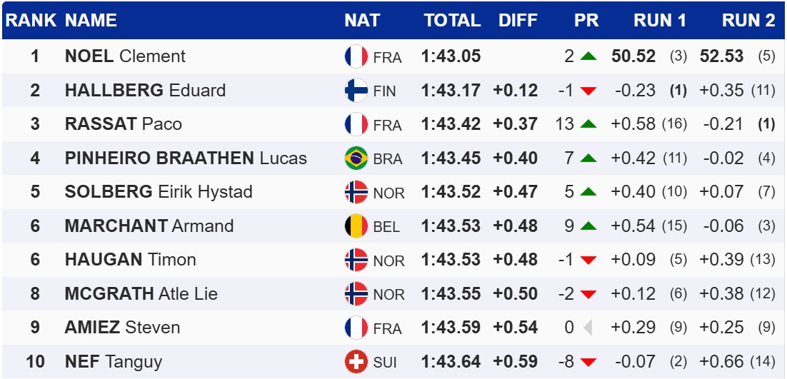 У Мадонна ді Кампільо Ноель ішов третім після першої спроби, проте зумів випередити лідера після першого раунду, фіна Едуарда Халльберга. Для фіна це другий в кар'єрі подіум на Кубку світу. Топ-3 замкнув партнер Ноеля по збірній Франції, Пока Расса, який піднявся з 16 місця після першої спроби.