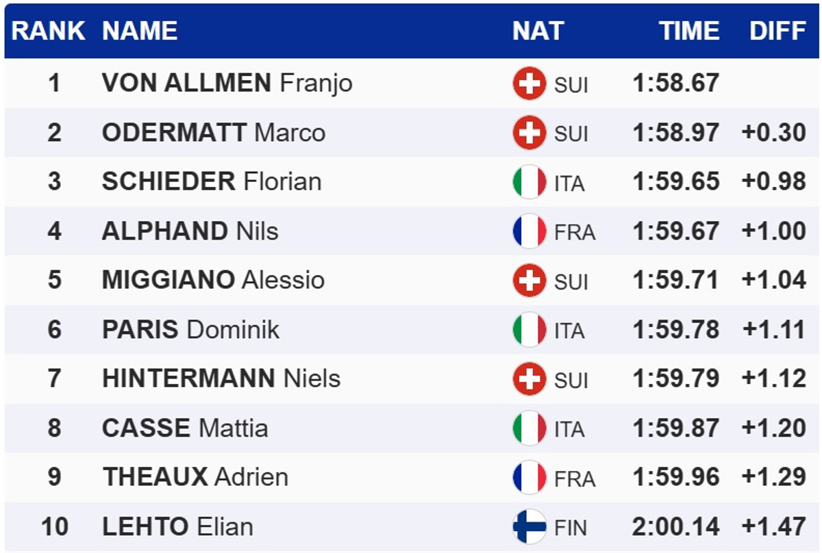 Фон Алльмен на 0,3 секунди випередив свого партнера по команда та лідера загального заліку Кубку світу, Марко Одерматта, який другий день поспіль посів друге місце. Топ-3 замкнув господар змагань, італієць Флоріан Шидер.