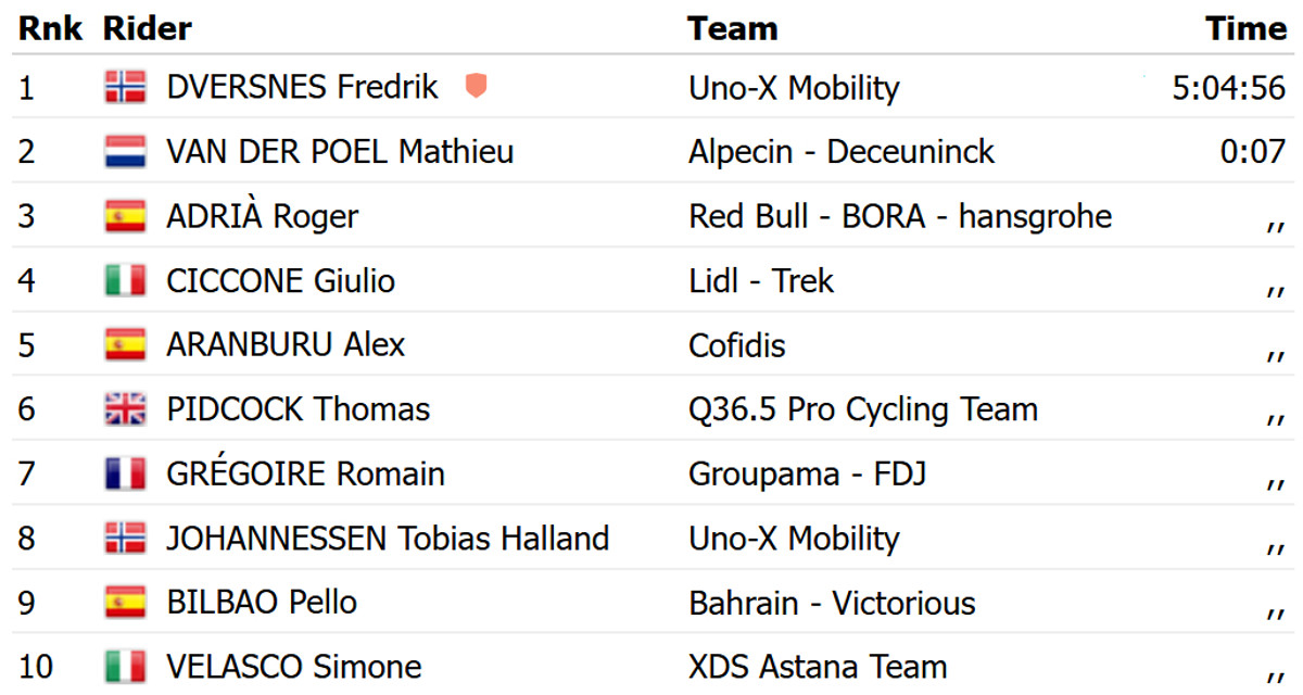 Дверснес брав участь у відриві дня, і виявився єдиним із втікачів, хто встояв під натиском пелотону. Спринт за друге місце з основної групи виграв нідерландець Матьє Ван дер Пул із Alpecin Deceuninck. Топ-3 замкнув іспанець Роджер Адріа з Red Bull Bora.