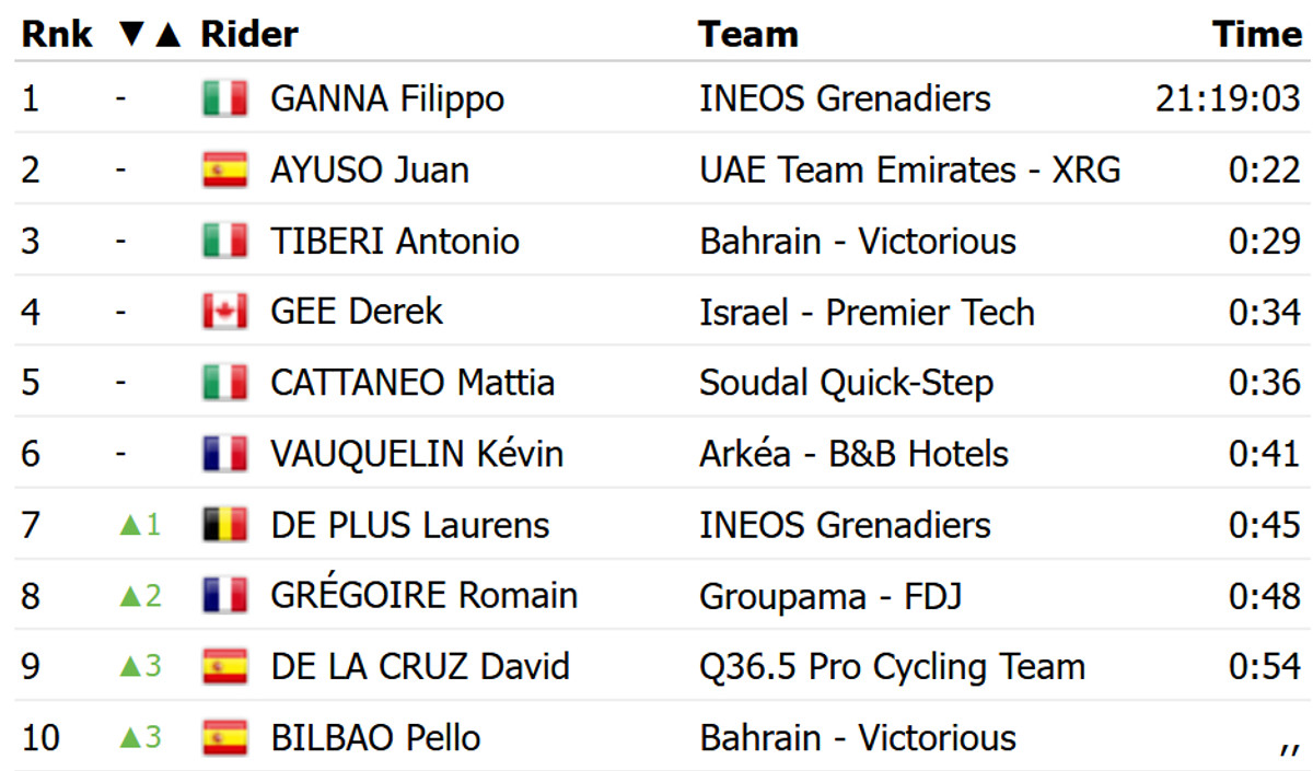 Синю майку лідера загального заліку зберіг італієць Філіппо Ганна з Ineos Grenadiers. На останніх 3 км дистанції він отримав прокол і відстав від пелотону, проте отримав час основної групи на фініші.