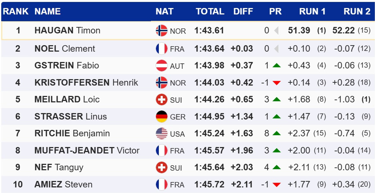 Сьогодні, 27 березня, Хауган на 0,03 секунди випередив француза Клемана Ноеля. Топ-3 замкнув австрієць Фабіо Гштрайн.
