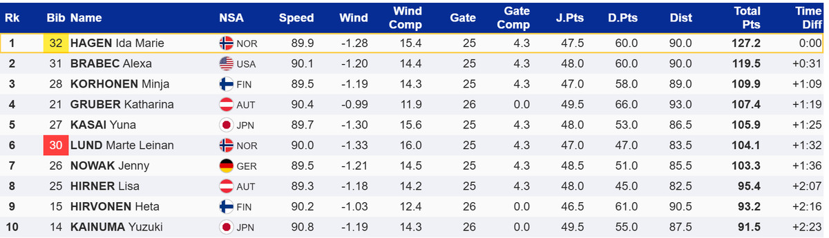 Переможницею етапу стала Іда Марія Хаген (Норвегія), друге місце посіла Алекса Брабец (США), а третє – Мінья Корхонен (Фінляндія).