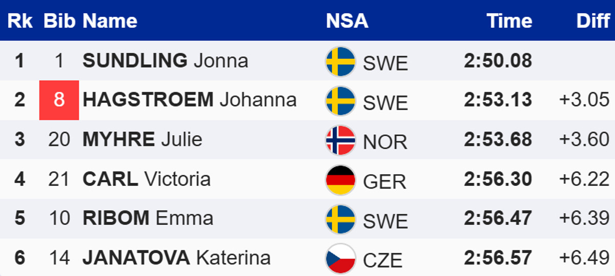 У жінок спринт виграла Йонна Сундлінг, для якої це перша перемога в поточному сезоні. Вона випередила партнерку по команді Йоханну Хагстрьом та господарку змагань, норвежку Юлі Мюре.