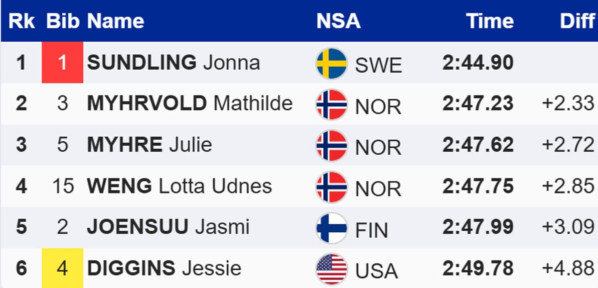У жінок рівних не було шведці Йонні Сундлінг. У фіналі вона випередила двох норвежок – Матільде Мюрволд і Юлі Мюре. Американка Джессіка Діггінс, яка очолює загальний залік Кубку світу, у вирішальному забігу посіла останнє, шосте місце.