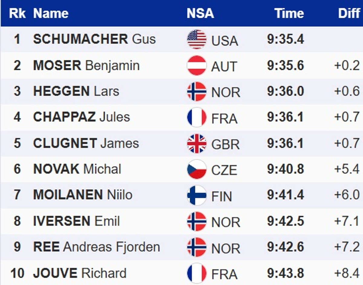 Шумахер у підсумку випередив своїх партнерів по другому забігу, австрійця Беньяміна Мозера та норвежця Ларса Хеггена. Для Мозера це перший у кар'єрі подіум на Кубку світу.