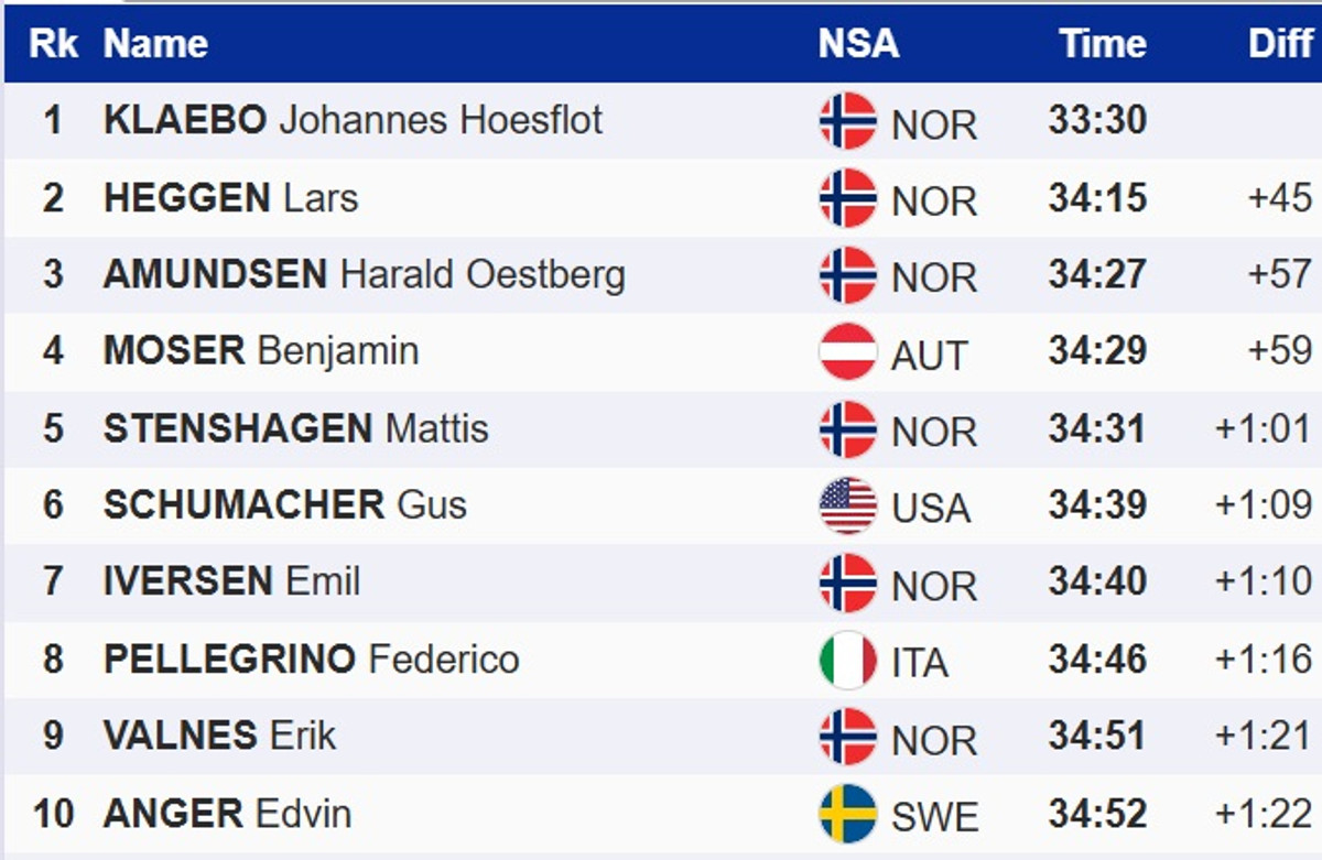 Лідер загального заліку, норвежець Йоханнес Клебо, виграв свій, третій забіг, проте в абсолюті показав лише 12-й результат. Це не завадило йому зберегти лідерство у генеральній класифікації Тур де Скі.
