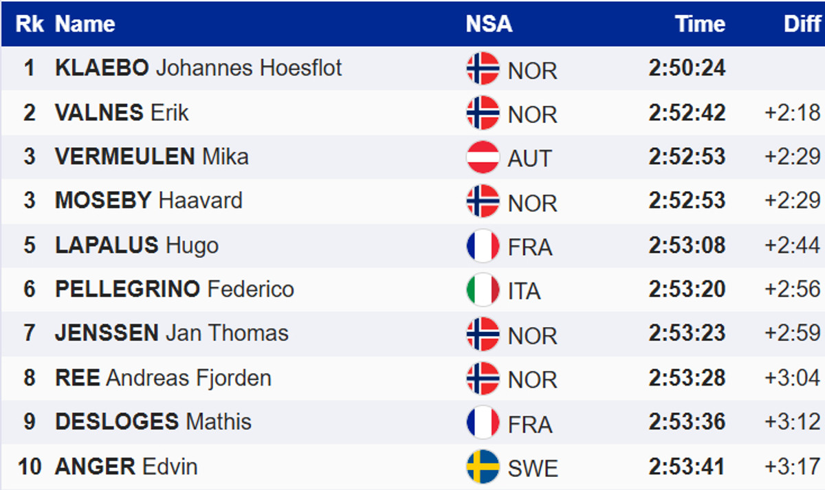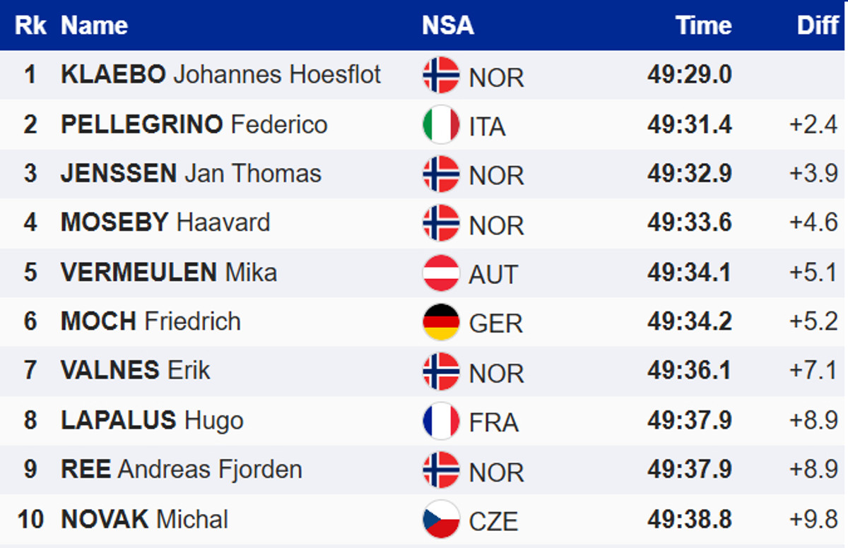 Вчора спринт класикою у Валь ді Ф’ємме також виграв Клебо. Тур де Скі завершиться у неділю, 5 січня традиційним масстартом на 10 км вільним стилем з фінішем у гору в Альпе ді Черміс.