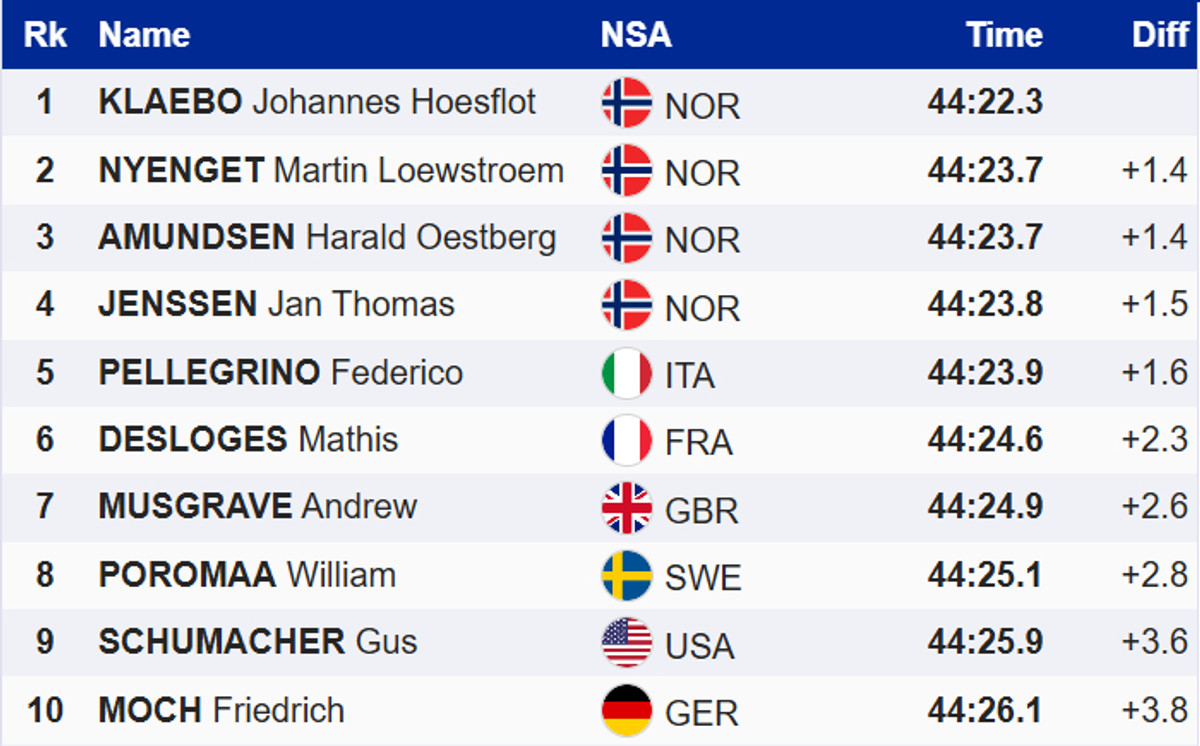 Компанію Йоханнесу на подіумі склали два партнери по команді – Мартін Льовстрьом Ньєнгет і Харальда Остберга Амундсена. Ще один норвежець, Сімен Хегстад Крюгер, захистити свій чемпіонський титул не зумів – лише 12 місце.