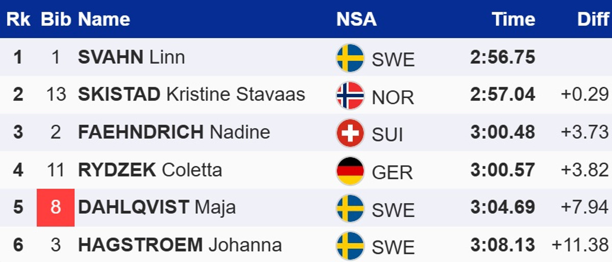 У жінок перемогу здобула свіжоспечена олімпійська чемпіонка в особистому спринті, шведка Лінн Сван. У фіналі господарка змагань випередила норвежку Крістін Шістад і швейцарку Надін Фендріх.