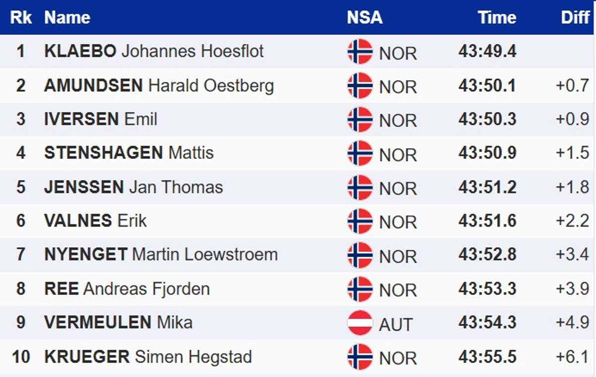 Збірна Норвегії повністю домінувала на домашній гонці, посівши перші 8 місць. Єдиним закордонним гонщиком у топ-10 став австрієць Міка Вермюлен – 9 місце.