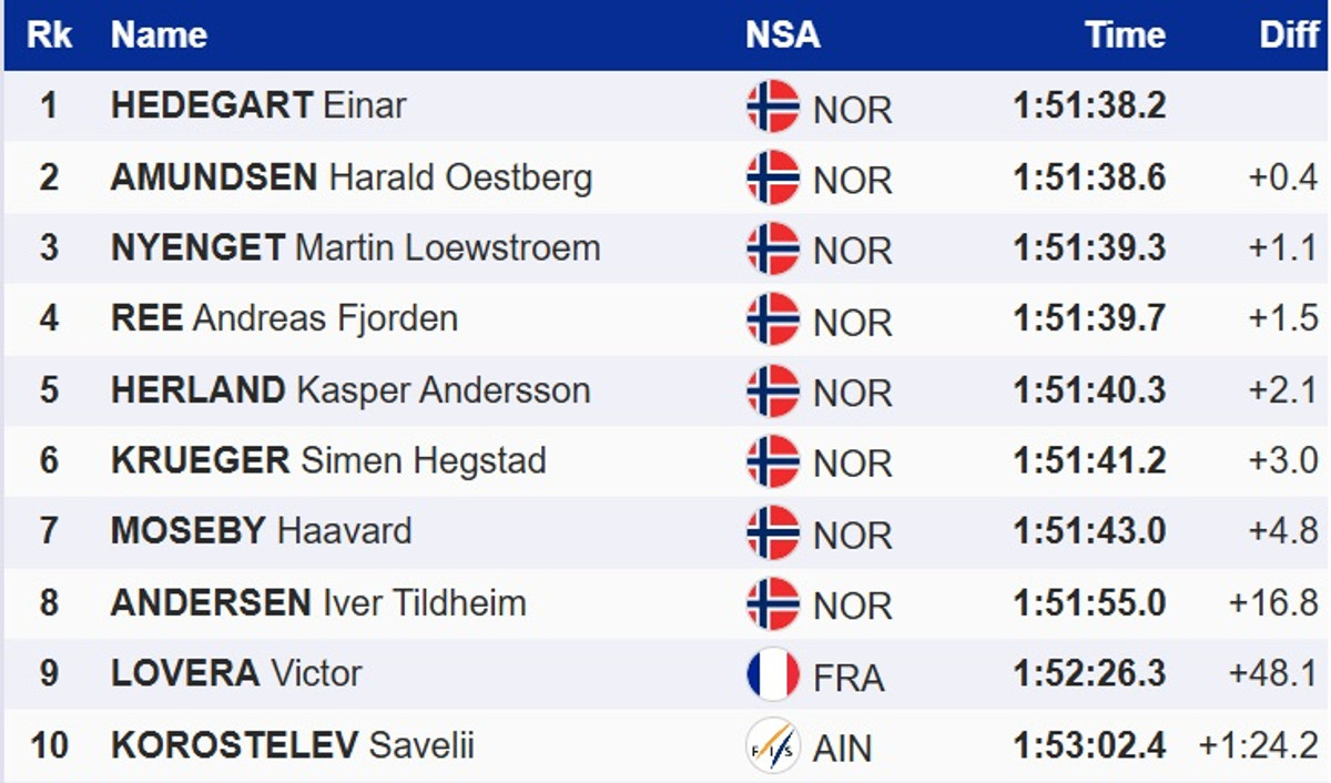 Хедегарт у фінішному спринті випередив двох партнерів по команді – Харальда Остберга Амундсена та Мартіна Льовстрьома Ньєнгета. Сумарно збірна Норвегії забрала перші 8 місць у домашній гонці.