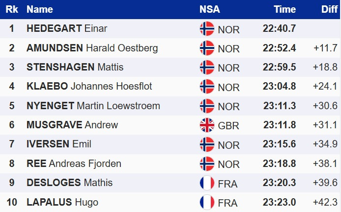 У Давосі Хедегарт на 11,7 секунди випередив свого партнера по команді Харальда Остберга Амундсена. Топ-3 замкнув ще один норвежець, Маттіс Стенсхаген. Лідер загального заліку Кубку світу, Йоханнес Клебо, фінішував четвертим.