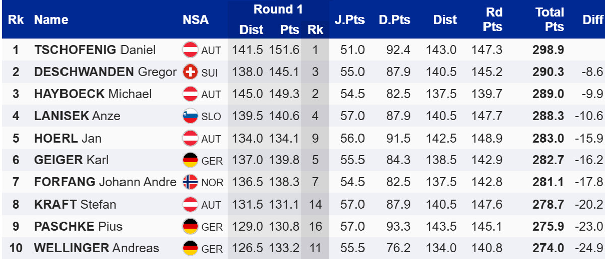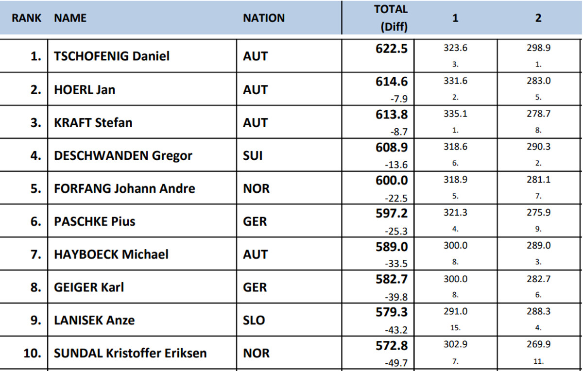 Цей успіх дозволив Чофенігу перехопили лідерство як у Турне, так і у загальному заліку Кубку світу. Переможець першого етапу, Штефан Крафт, сьогодні фінішував лише восьмим.