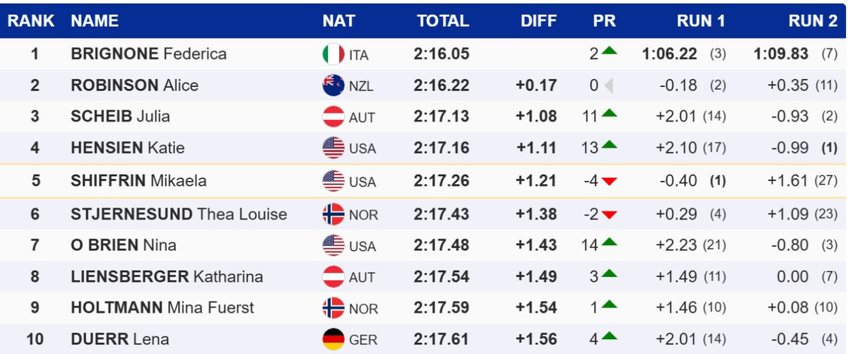 Топ-3 замкнула 26-річна господарка змагань, Юлія Шайб, для якої це перший в кар’єрі подіум на Кубку світу. Зіркова Мікаела Шиффрін лідирувала після першої спроби, проте у другій відступила на п’яте місце.