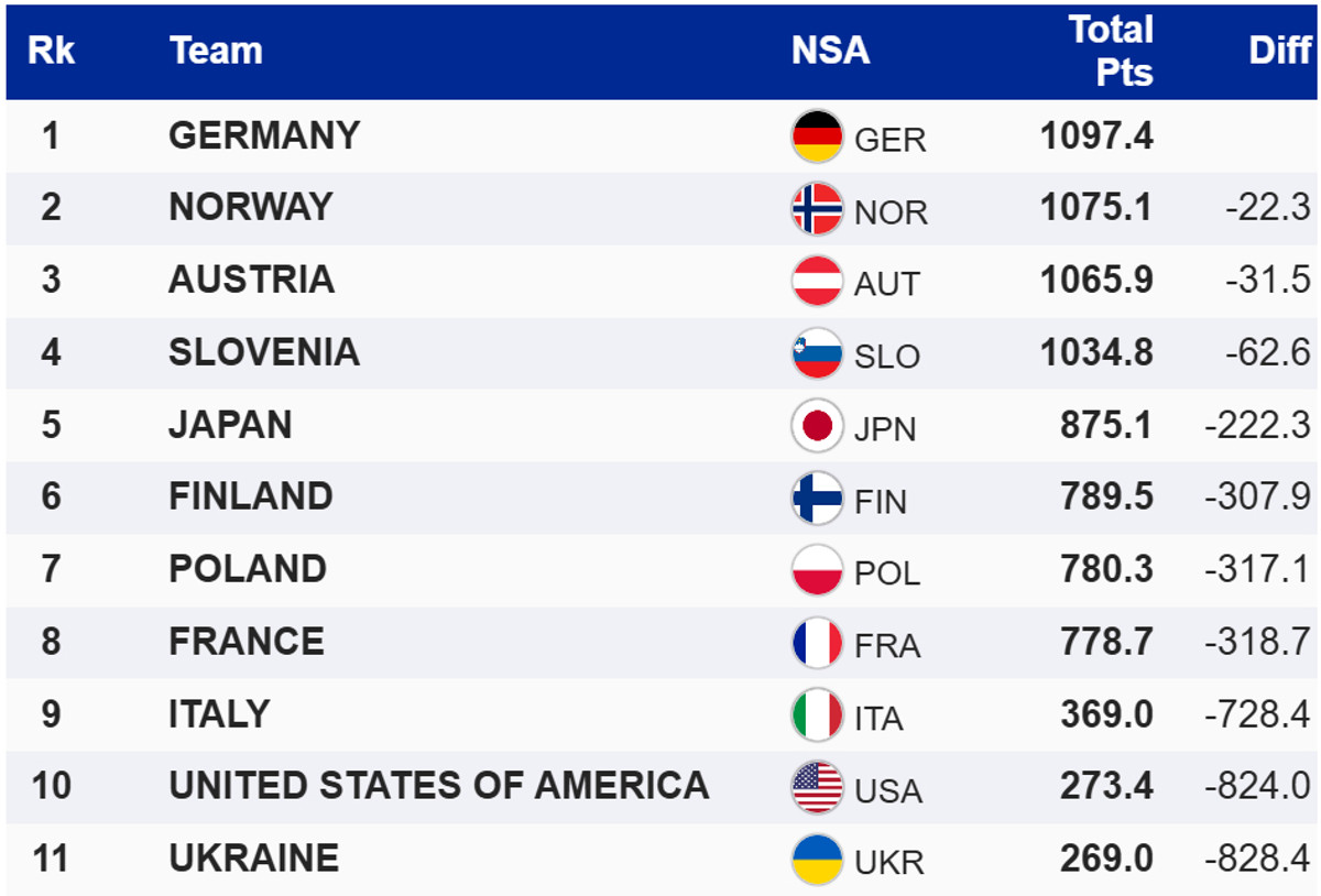 Бундестім на 22,3 бали випередив господарів, збірну Норвегії (Анна Одін Стрьом, Крістоффер Еріксен Сундал, Ейрін Марія Квандал, Маріус Ліндвік). Топ-3 замкнула Австрія (Ліза Едер, Даніель Чофеніг, Ева Пінкельніг, Ян Хьорль).