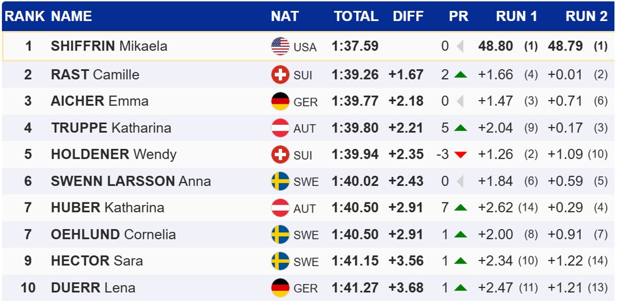 Сьогодні в Шпиндлерув Млині Шиффрін розгромила своїх суперниць, випередивши найближчу переслідувачку, швейцарку Каміль Раст, на 1,67 секунд. Німкеня Емма Айхер, яка посіла третє місце, програла Шиффрін більше двох секунд.