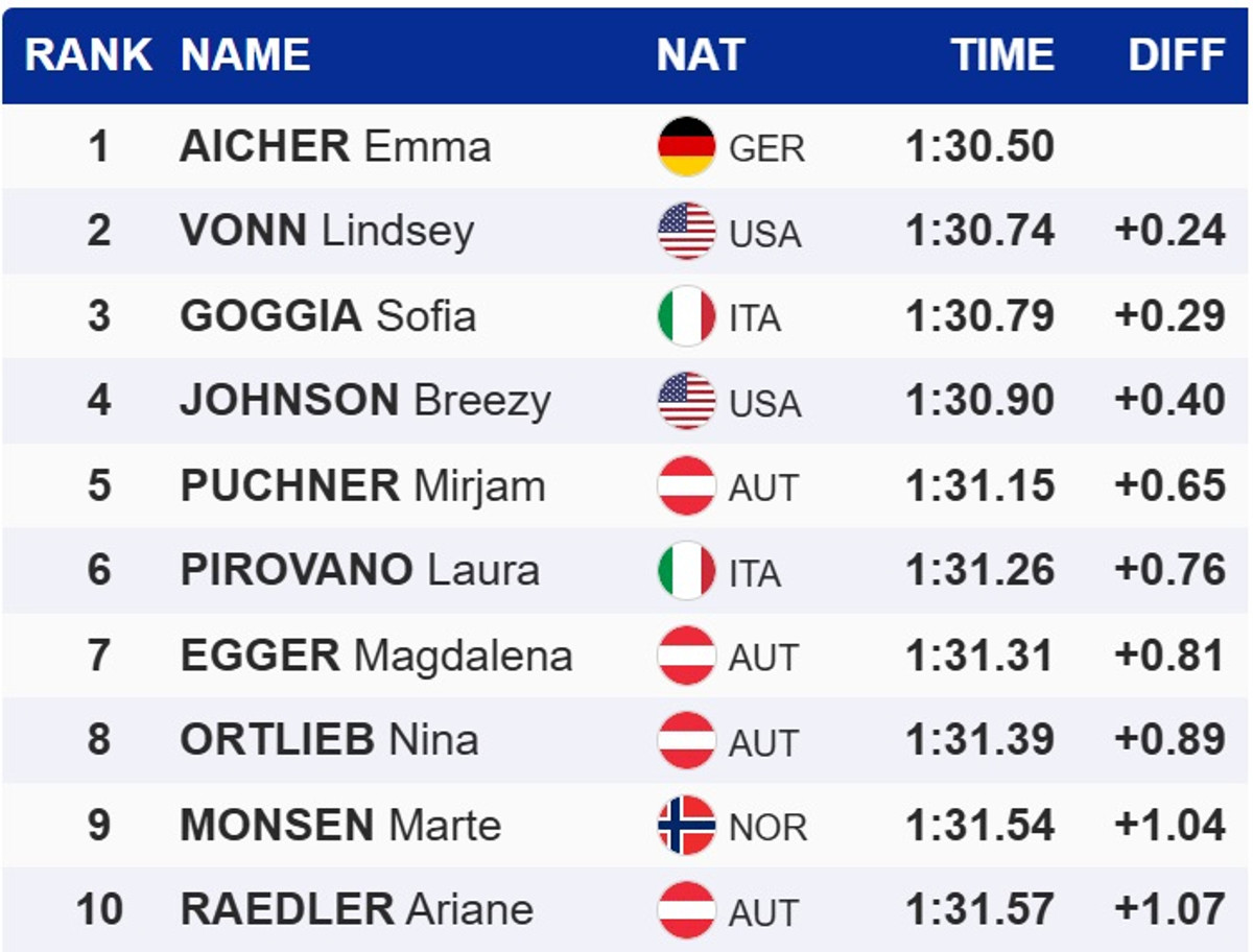 Айхер на 0,24 секунди випередила переможця вчорашнього швидкісного спуску, легендарну американку Ліндсі Вонн, яка вчора стала найстаршим переможцем гонки в історії Кубку світу. Топ-3 замкнула зіркова італійка Соф'я Годжа. 7 місце посіла австрійка Магдалена Еггер, яка вчора вперше в кар'єрі піднялася на подіум.