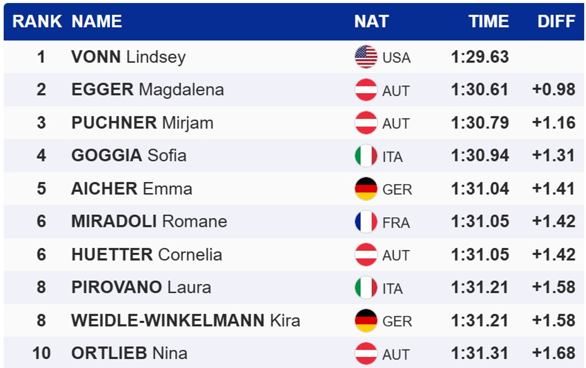 Для 41-річної Вонн це перша перемога на Кубку світу з 14 березня 2018 року, коли вона виграла швидкісний спуск у шведському Оре. В 2019 році американка завершила кар'єру, проте повернулася в спорт перед стартом сезону-2024/25.