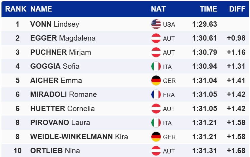 Топ-3 замкнула ще одна австрійка, Мір'ям Пухнер. Зіркова італійка Соф'я Годжа фінішувала четвертою. Еггер вперше в кар'єрі піднялася на подіум на Кубку світу.