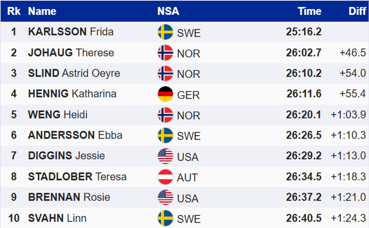 Розгромну перемогу здобула шведка Фріда Карлссон, яка випередила Йохауг аж на 46,5 секунди. Топ-3 замкнула ще одна представниця збірної Норвегії, Астрід Ойре Слінд, яка на 1,4 секунди випередила німкеню Катаріну Хенніг.