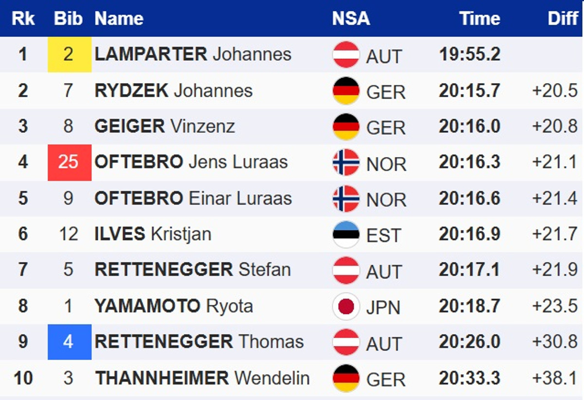 У Отепя Лампартер на 20 секунд випередив найближчих переслідувачів, якими стали два німці – Йоханнес Ридцек і Вінценц Гайгер. Вони виграли спринт із групи переслідувачів за друге та третє місця відповідно. Норвежець Єнс Лурос Офтебро втретє поспіль фінішував четвертим.