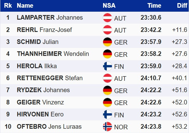На фініші Лампартер на 11,6 бала випередив партнера по команді Франца-Йозефа Рерля та німця Юліана Шміда. Для Йоханнеса це третя перемога в чотирьох стартах у поточному сезоні. Шмід втретє піднявся на подіум.