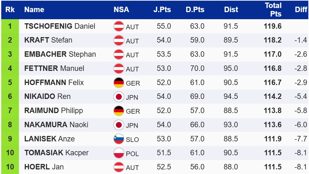 Домінувала в кваліфікації збірна Австрії, яка забрала перші чотири місця. Перемогу здобув віцелідер Кубку світу Даніель Чофеніг, який випередив Штефана Крафта та Штефана Ембахера.