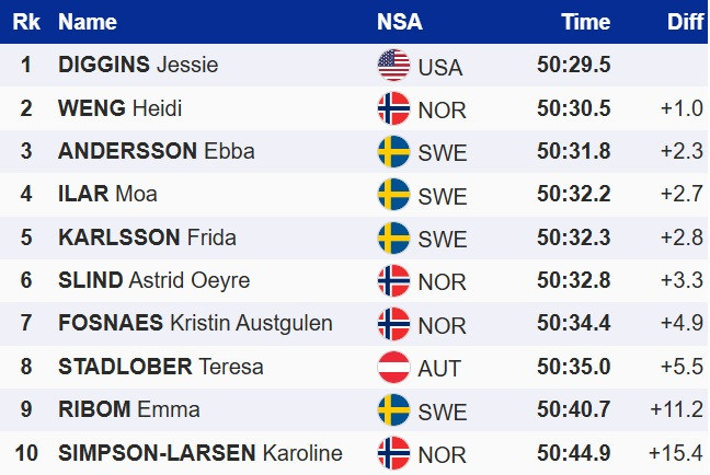 В фінішному спринті Діггінс випередила господарку змагань, норвежку Хейді Венг. Топ-3 замкнула шведка Ебба Андерссон.