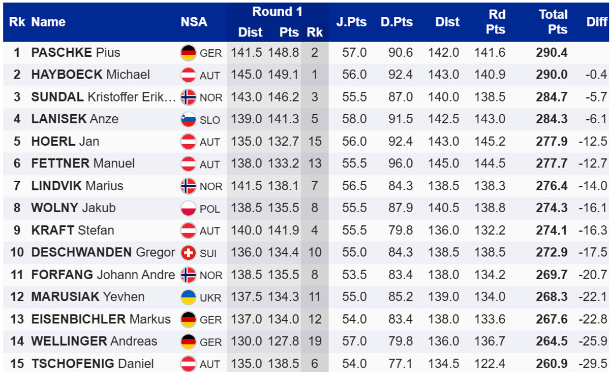Свою п’яту перемогу в сезоні здобув господар змагань і лідер Кубку світу, німець П’юс Пашке. Він всього на 0,4 бала випередив переможця кваліфікації, австрійця Міхаеля Хайбьока. Третім став норвежець Крістоффер Еріксен Сундал.